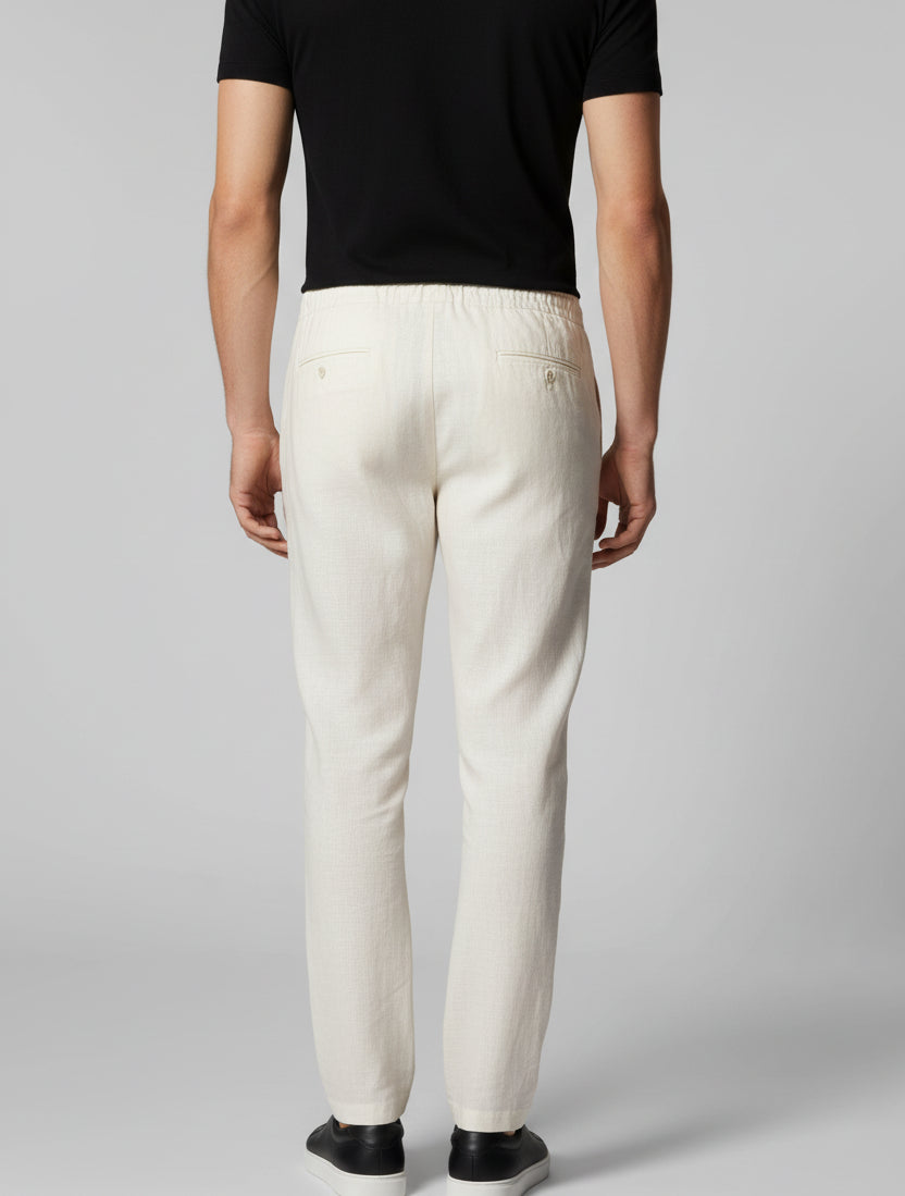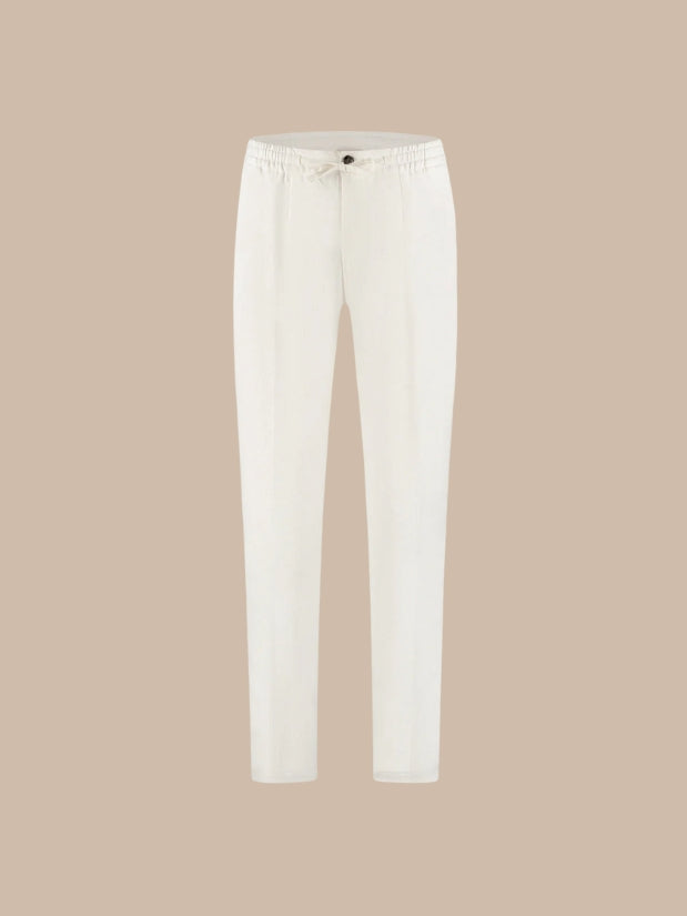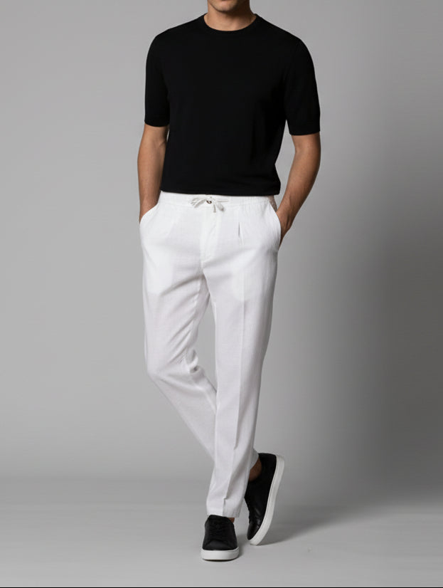 Disse bukser er fremstillet i let, åndbart hør, der føles blødt mod huden og lader kroppen ånde hele dagen. Den justerbare snøre i taljen sikrer en personlig pasform, mens det smalle, raffinerede snit giver en elegant silhuet. Perfekte til solrige dage, kombiner dem med en luftig poloshirt eller en afslappet skjorte for et look, der balancerer afslappet komfort med sofistikeret raffinement.