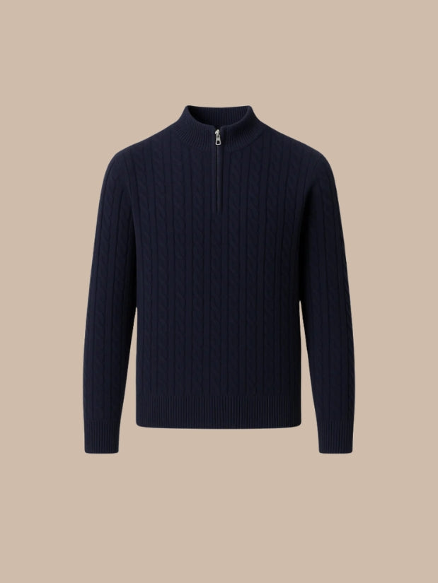 Finish: Half-zip med poleret lynlås, ribbet krave og manchetter, kabelstrik over hele fladen.